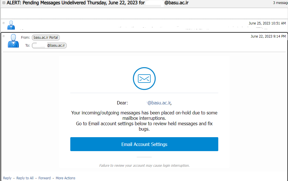 پیرو اطلاعرسانیهای قبلی در صورتی که ایمیلی با موضوع کلیک بر روی لینک خاص برای دستیابی به ایمیل و یا ایمیل با موضوعات مشابه دریافت کردید، ایمیل جعلی بوده و به منظور سوء استفاده از اکانت شما ارسال گردیده است. یادآوری میشود که مدیریت فناوری اطلاعات به هیچ عنوان چنین پیام هایی را ارسال نمیکند.